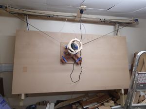 Before you switch anything on, the Maslow must be pulled forward so that the cutting bed is at an angle. The whole thing is hinged at the top, pull it out and swing the props back so they hold it in place. You should use the bolts to make sure they can't move. See the picture on the right.