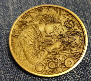 The prompt used is "bas relief female soldering makerspace hobbyist surrounded by circuits and cogs round emblem" the important bit is "bas relief" for the 3D and "round emblem" for a coin. Unfortunately specifying female (if that's what you want) is required as sexism is alive and well in the AI world.